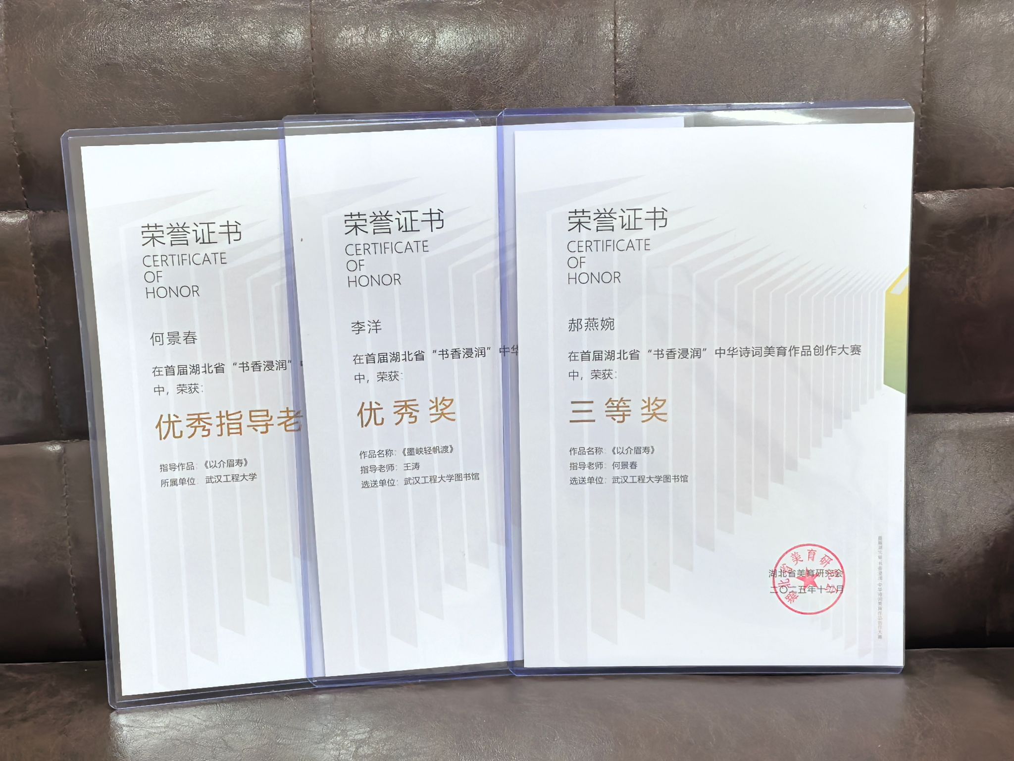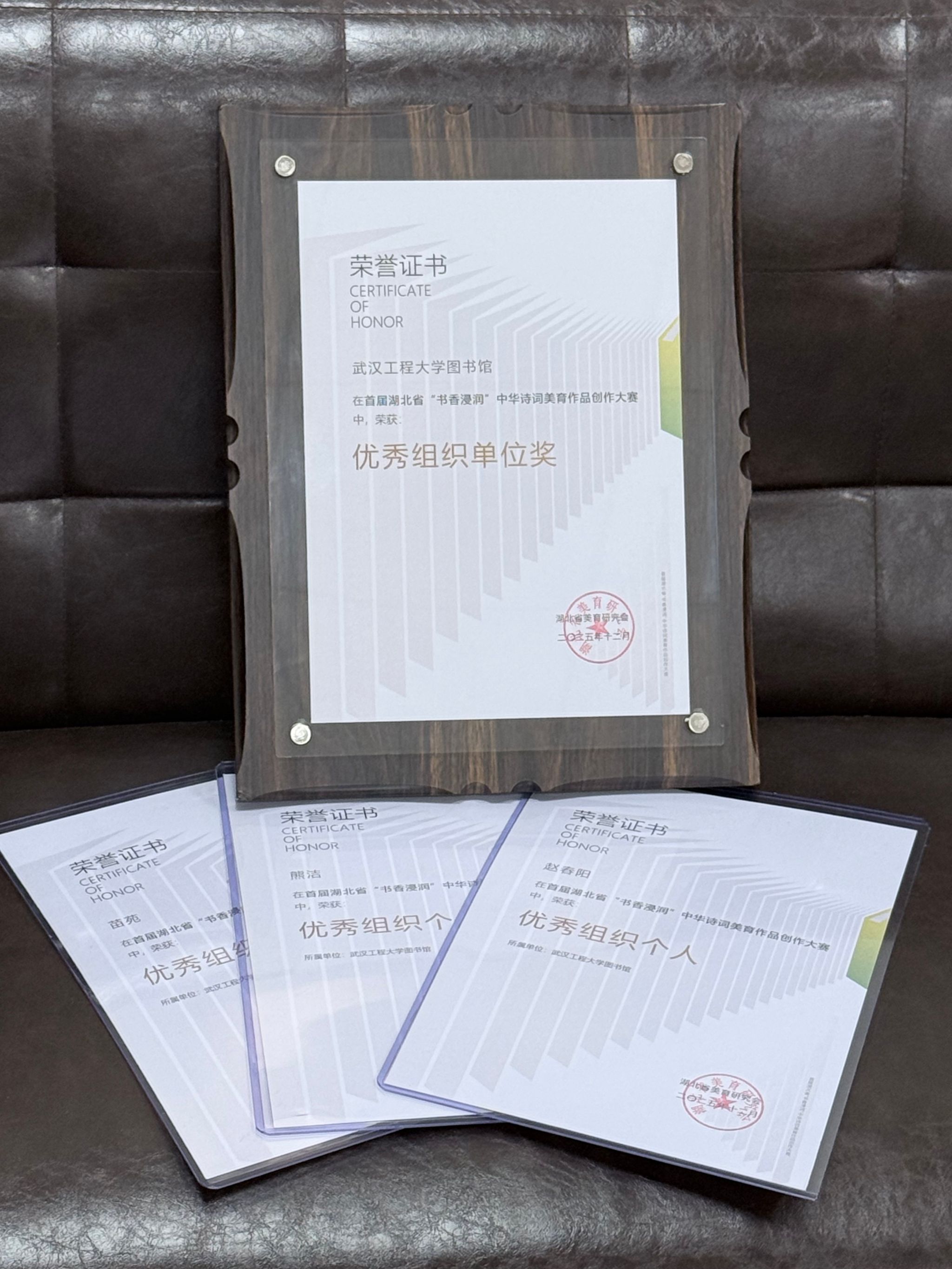 本网讯(通讯员 苗苑)为深入学习贯彻党的二十大精神,积极响应十四届全国人大三次会议关于“完善公共文化服务体系,推动优质文化资源直达基层”的要求,充分发挥湖北省高校在全民阅读推广与美育实践中的阵地作用,首届湖北省“书香浸润”中华诗词美育作品创作大赛于2025年5月30日启动。近日,大赛评审结果正式揭晓,我校师生表现出色,斩获多项荣誉:来自马克思主义学院郝燕婉同学的作品《以介眉寿》荣获三等奖,李洋同学的作品《墨峡轻帆渡》荣获优秀奖;该院何景春老师获评“优秀指导老师”;学校获授“优秀组织单位”称号;赵春阳、熊洁、苗苑三位老师获评“优秀组织个人”。