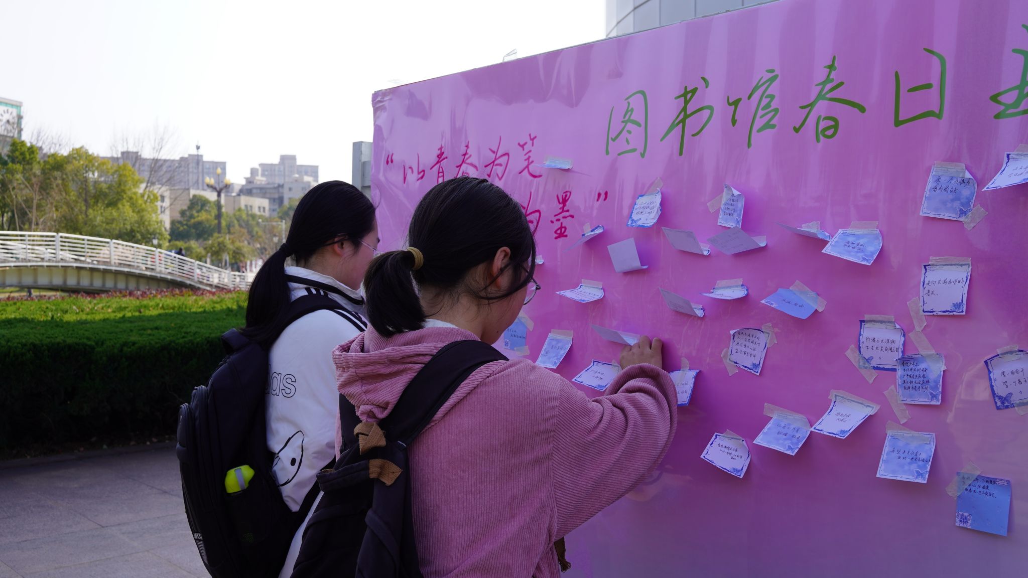 书展旁同步设置“春天,有话想对你说”春日寄语留言区,读者以花朵、绿叶造型的便签为载体,将阅读感悟、新学期规划与美好期许落于笔端,张贴于留言板上。一句句真挚文字,传递书香温度,尽显校园文化情怀。