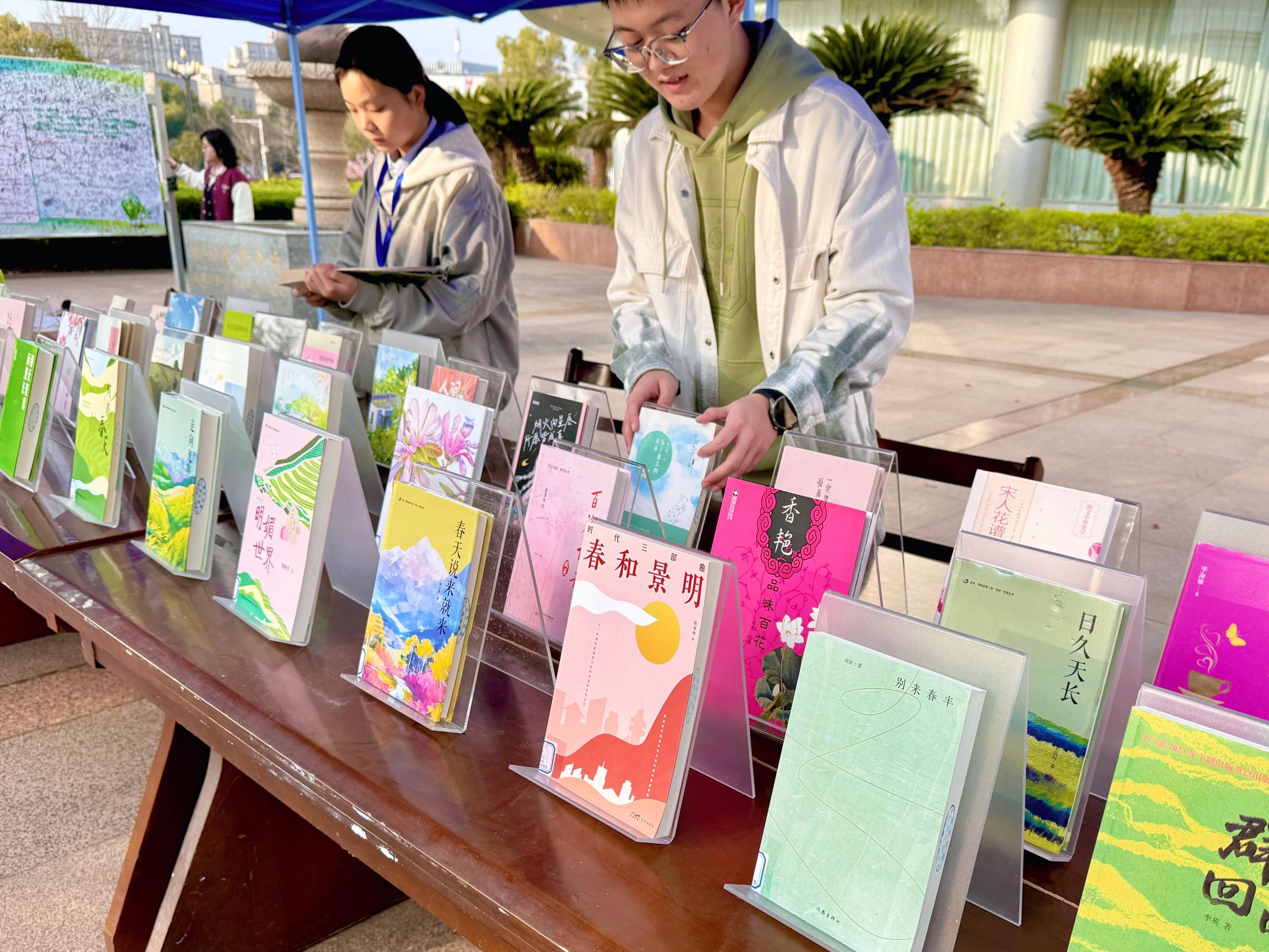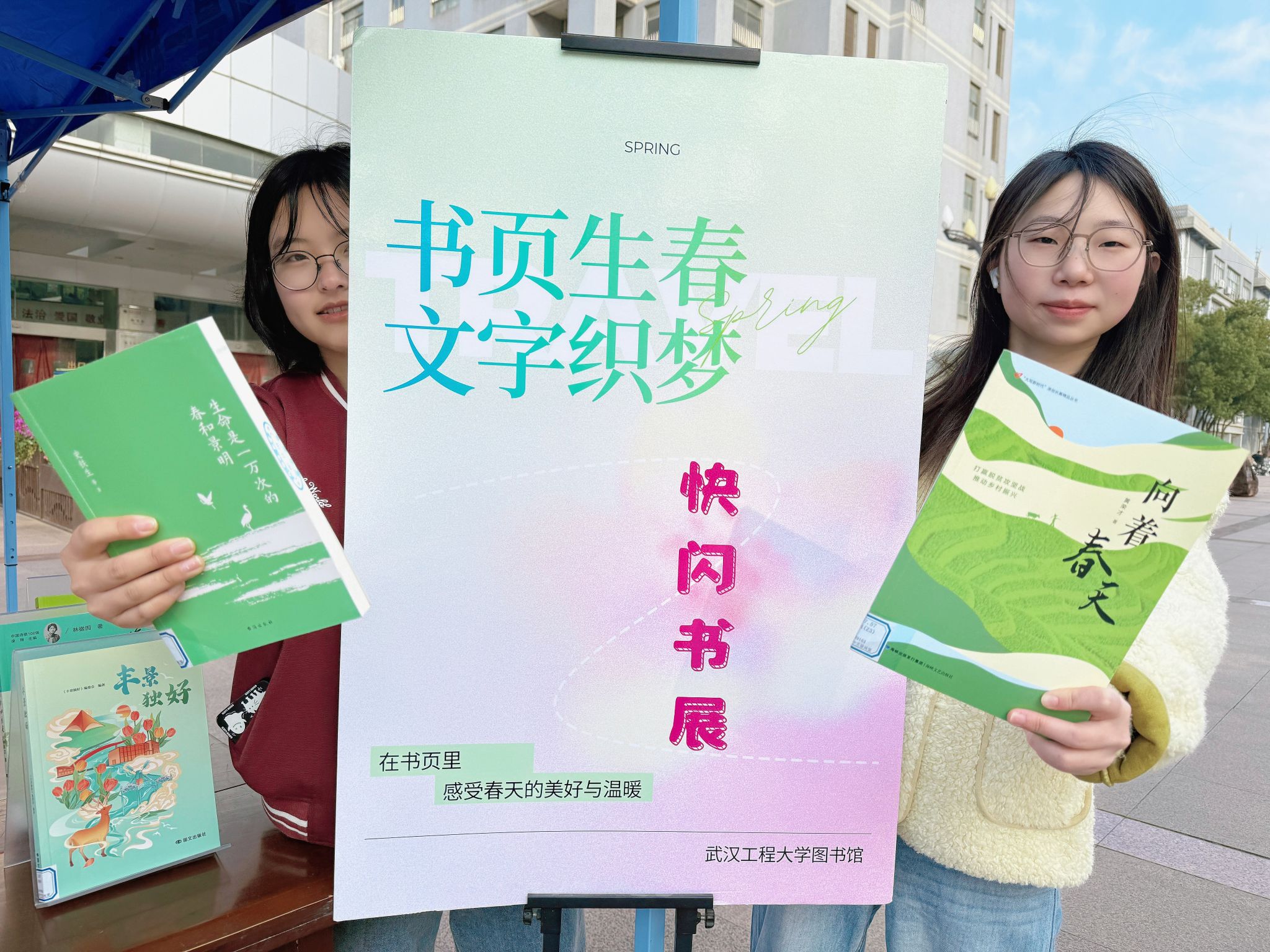 本次快闪书展打破馆内阅读场景限制,让书展从馆内走向了馆外,以“春”为主题,精选经典文学、散文随笔、自然科普等优质书目集中陈列。工作人员特别甄选符合主题的绿色系、粉色系封面的图书,从视觉层面营造盎然春意,往来师生纷纷驻足翻阅品读,沉浸式感受文字魅力,现场书香氤氲。活动当日,展出的40余册图书便所剩无几,总借阅人次达30余人。